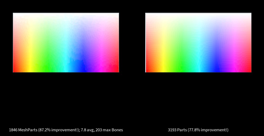 Using skinned meshes instead of parts to reduce the part count for Boatbomber’s ViewportCanvas. Unfortunately, the initial rendering takes way too long to be feasible.